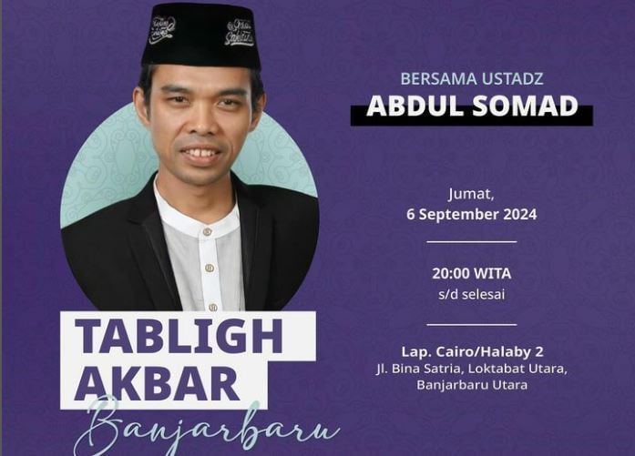 Rencananya Tabligh Akbar bersama UAS itu akan dilaksanakan Jumat (06/09/2024) malam sekitar pukul 20.00 WITA, bertempat di Lapangan Cairo atau Halaby 2, Jalan Bina Satria, Kelurahan Loktabat Utara, Kecamatan Banjarbaru Utara.